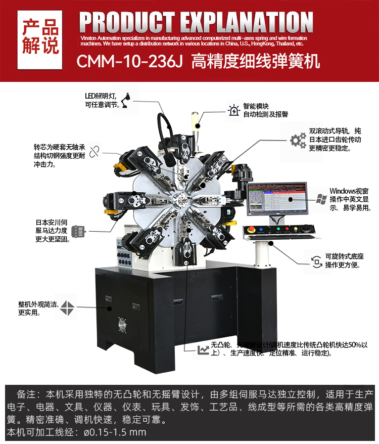 • 產(chǎn)品概述: CMM-10-236J 高精度細線彈簧機 可生產(chǎn)?0.15-1.5 mm線徑彈簧及線成形等)本機采用獨特的無凸輪和無搖臂設(shè)計,由多組伺服馬達獨立控制,可以生產(chǎn)各種各樣異型彈簧、壓簧、雙扭簧、電池簧、扁簧(發(fā)條簧)及各種線成型等。精密準(zhǔn)確、調(diào)機快速、穩(wěn)定可靠。