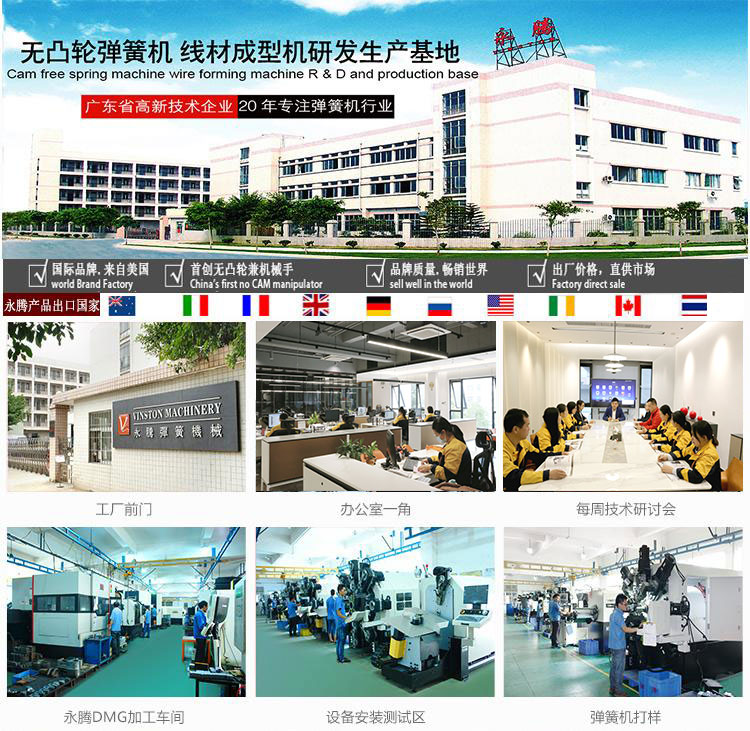 東莞永騰自動化設(shè)備有限公司(vinston)是一家專業(yè)生產(chǎn)CNC多軸多功能無凸輪電腦彈簧機、線材成型機和銅鋁排折彎機的美國獨資企業(yè)。本公司從2001年開始運用美國先進的伺服控制技術(shù)進行一次具有重要意義的技術(shù)改革,打破傳統(tǒng)的凸輪帶動成型模式,成為行業(yè)創(chuàng)新的無凸輪模式兼?zhèn)錂C械手的彈簧機??杉庸ぞ€徑0.15-12mm范圍彈簧及線材成型。
