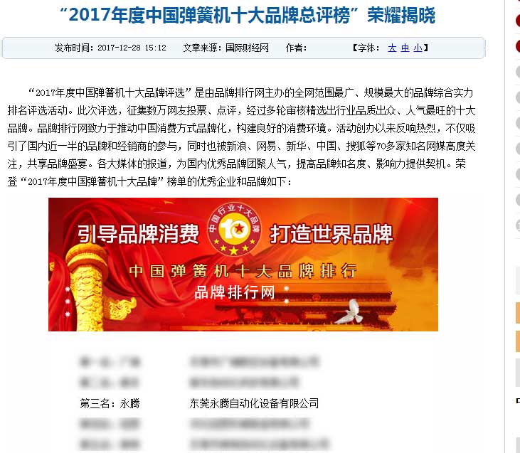 永騰榮獲2017年度中國(guó)彈簧機(jī)十大品牌日期:2018-01-05???? 人氣:1679
