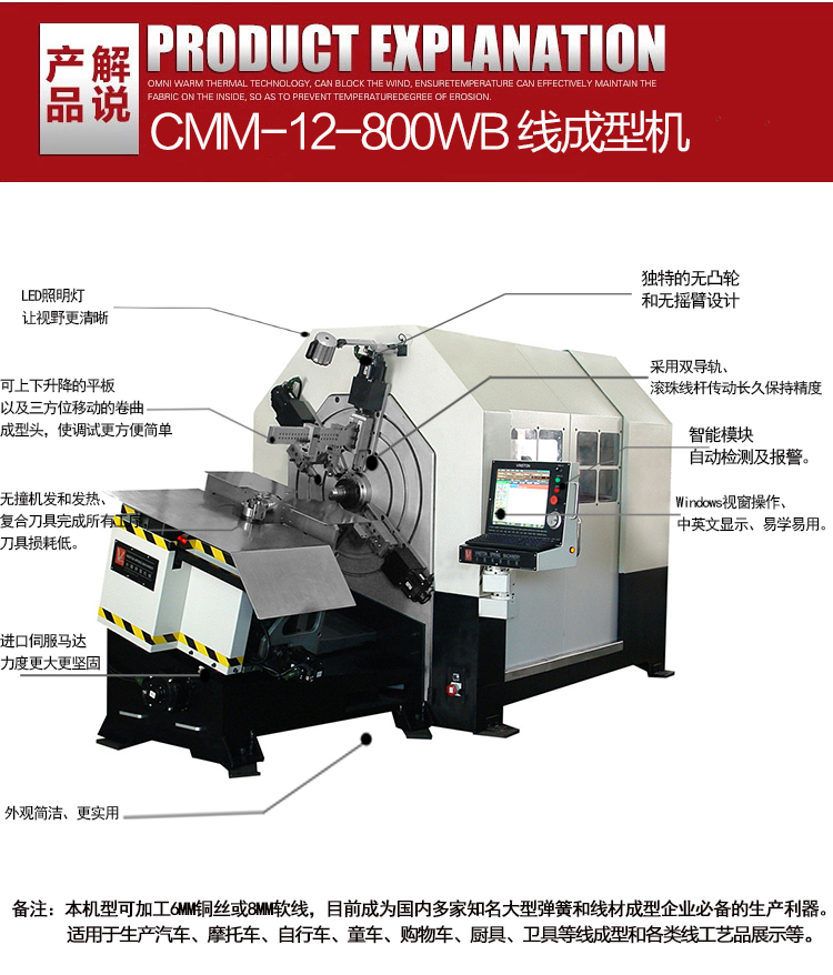 五、永騰線材折彎機CMM-12-800R機加工區(qū)域能上下左右前后移動成型,以及穩(wěn)定桿的輔助支撐作用,確保該機比其他平板線成型機生產(chǎn)更穩(wěn)定、更快速。