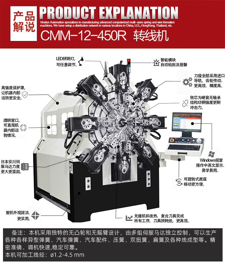 • 產(chǎn)品概述: CMM-12-450R 轉(zhuǎn)線彈簧機(jī)可生產(chǎn)?1.2-4.5 mm線徑彈簧及線成形等),本機(jī)采用獨(dú)特的無凸輪和無搖臂設(shè)計(jì),由多組伺服馬達(dá)獨(dú)立控制,可以生產(chǎn)各種各樣異型彈簧、汽車彈簧、汽車配件、壓簧、雙扭簧、扁簧及各種線成型等。精密準(zhǔn)確、調(diào)機(jī)快速、穩(wěn)定可靠。