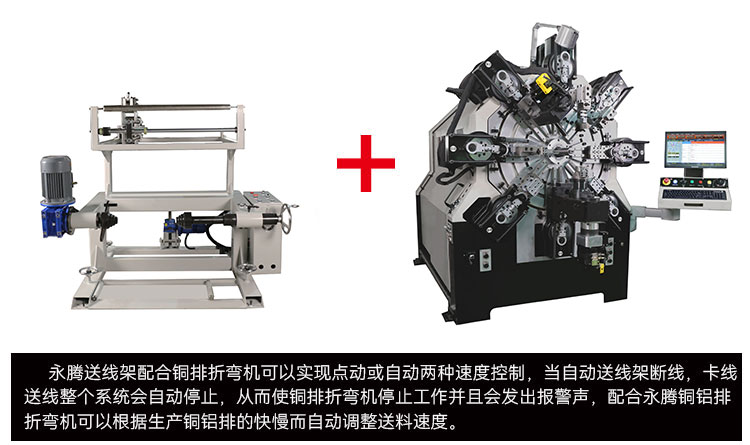 桶式料架是配合銅排折彎?rùn)C(jī)生產(chǎn)銅排之用,采用變頻器技術(shù)與本公司的CNC控制系統(tǒng)控制技術(shù)相結(jié)合的控制方式,有助于提高生產(chǎn)銅排的精度與速度,同時(shí)也可以作為其它機(jī)器送料之用。本設(shè)備配合永騰銅排折彎?rùn)C(jī)可以實(shí)現(xiàn)點(diǎn)動(dòng)或自動(dòng)兩種速度控制,當(dāng)自動(dòng)送線架斷線、卡線,送線整個(gè)系統(tǒng)會(huì)自動(dòng)停止從而使銅排折彎?rùn)C(jī)停止工作并且會(huì)發(fā)出報(bào)警聲,配合本公司的銅排折彎?rùn)C(jī)可以根據(jù)生產(chǎn)銅排的快慢而自動(dòng)調(diào)整送料速度。